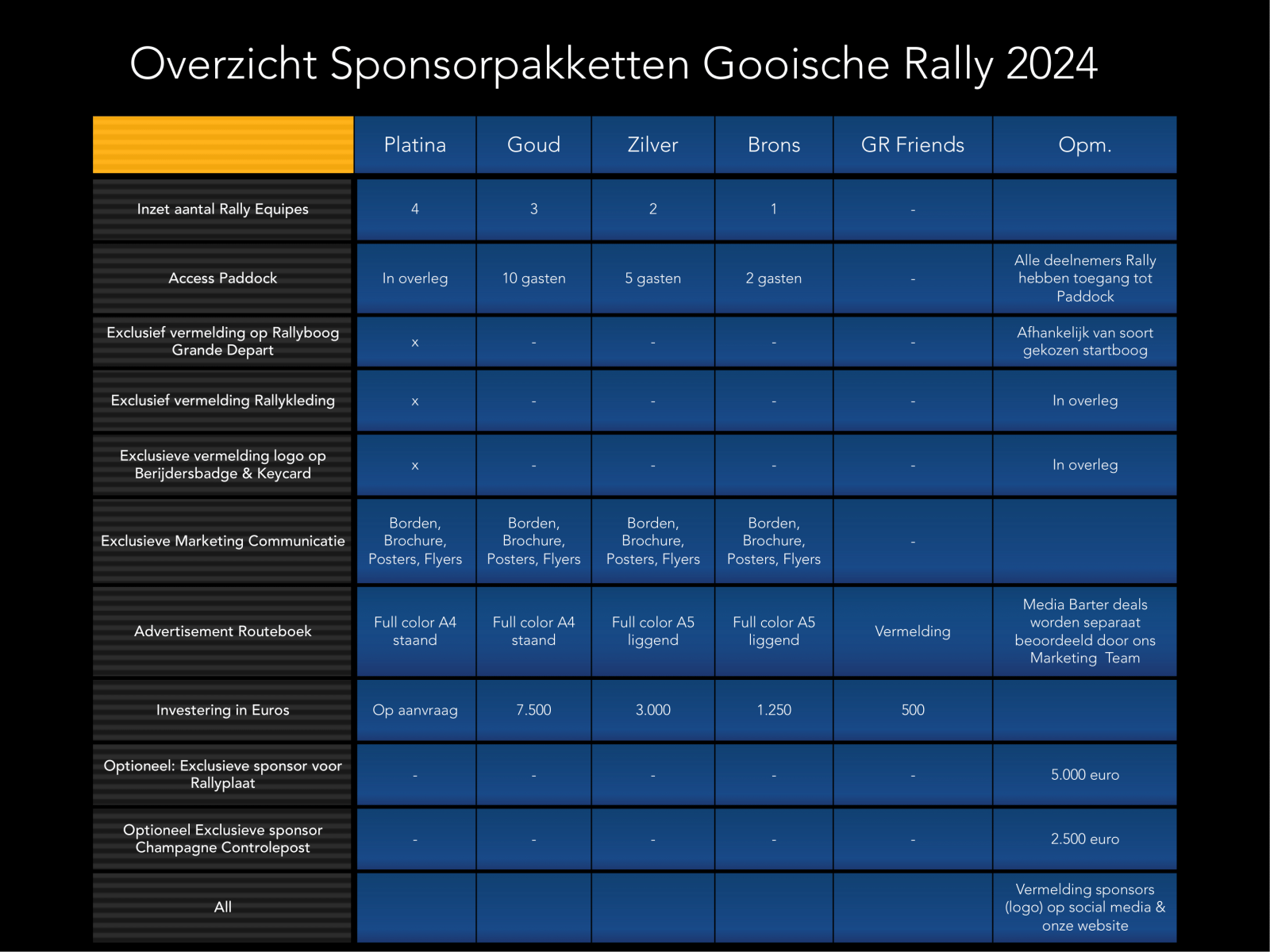 Weten waarom het interessant is om de Gooische Rally te sponsoren? Download het informatiebulletin hieronder en lees over de voordelen en de ervaringen uit de mond van de hoofdsponsor van de 2024 en 2023 edities. En hoe je als sponsor plezier en gezelligheid combineert met zakelijk voordelen!